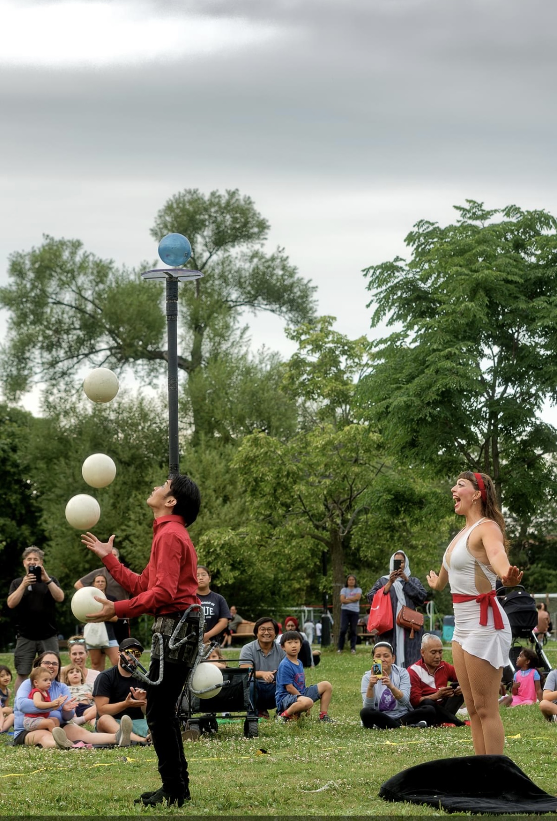 Anouk et Ryunosuke, artistes de cirque chevronnés qui ont parcouru le monde pour éblouir les publics, vous invitent à un instant poétique, comique et plein d’émerveillement. À travers leurs prouesses acrobatiques et un visuel circassien impressionnant, ce duo crée une expérience à la fois touchante et spectaculaire. Leur performance, soutenue par une trame musicale dynamique et lyrique, accompagnée de costumes aux couleurs vives, marie habilement rires et émotions.